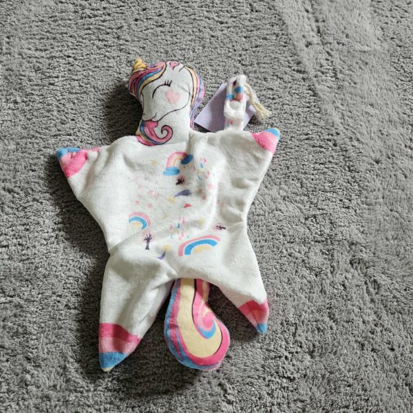 Doudou licorne très doux avec son attache tétine, ideal pour le confort du bébé a la naissance
