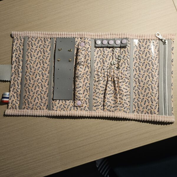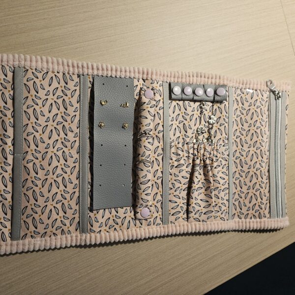Etui à bijoux composé de plusieurs poches, et de divers compartiments pour ranger les bouches d’oreilles, les bagues, les colliers, ….